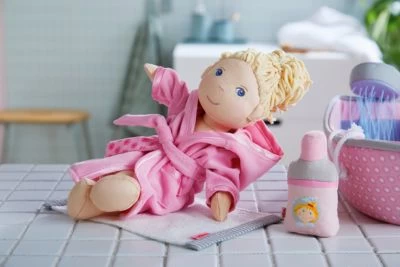 HABA Kleiderset Badespaß. Mit diesem Kleiderset sind die Puppenlieblinge nach dem Baden passend angezogen. Der Bademantel ist kuschelig-weich und mit dem Gürtel schnell zugebunden. Besonders praktische Accessoires sind das niedliche Handtuch und das Shampoo.