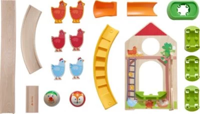 HABA Kullerbü – Kugelbahn Hühner-Domino. Nanu, ein Huhn in Pelz? Oh nein – Fuchs Frederik ist im Hühnerstall Bauer Björn kullert sofort dorthin, um seinen Hennen zur Hilfe zu kommen. Die feinen Damen schauen zu, wie sich Fuchs und Bauer ein Rennen durch das Scheunentor liefern. Wer erreicht zuerst die Hühnerleiter und schubst die Dominosteine um?