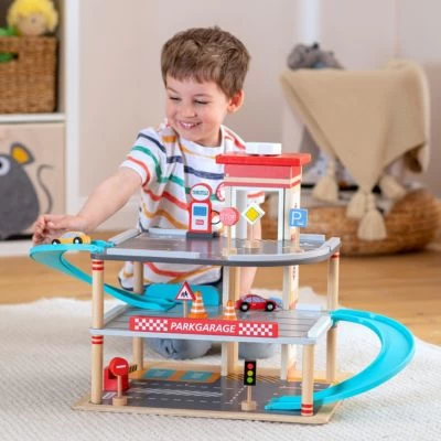 Für alle kleinen Fahrzeug-Fans und Einparkkünstler*innen: Mit diesem mehrteiligen Spielzeugset „Parkgarage“ mit Accessoires von myToys kommt der optimale Begleiter für kreative Fahrerlebnisse und Einpark-Abenteuer. Das coole Parkhaus kann von allen Seiten auf 3 Ebenen bespielt werden. Müssen die drei Holz-Flitzer noch tanken? Kein Problem, denn eine Tankstelle findet sich hier auch. Und dann kann es losgehen: Zwei Rampen führen aufwärts und eignen sich natürlich auch zum Runtersausen. Mit den Verkehrsschildern können erste Straßenverkehrsregeln geübt werden. Neben dem großen Spielevergnügen werden auch die feinmotorischen Fertigkeiten trainiert und die Vorstellungskraft gefördert.